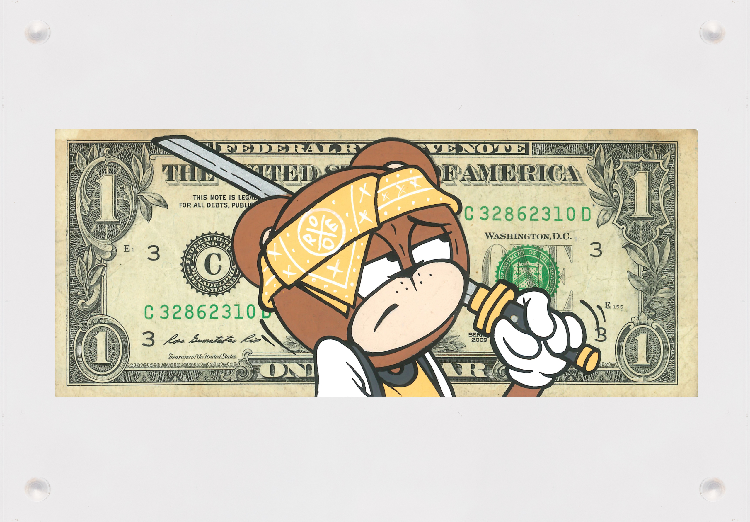 Badass Bear modèle unique sur Billet de 1 $ original présenté dans un cadre photo acrylique,