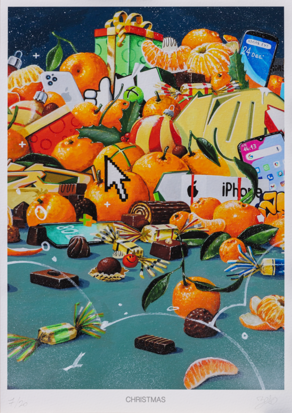ZESO Print « Christmas » Edition limitée à 20 exemplaires, Print digital, format A3 sur papier texturé 240g. Print réhaussé, signé et numéroté de la main de l’Artiste Non encadré.